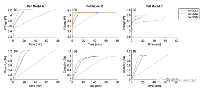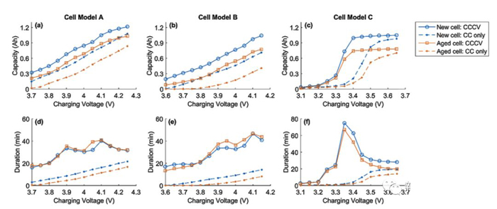 所謂的加速充電模式是在CCCV充電模式的基礎上增加了一個大電流的CC或者恒功率充電過程,從而達到降低充電時間的目的(如下圖e所示),有研究表明加速充電模式能夠有效的提升鋰電池的充電效率,同時又不會對鋰電池的循環(huán)壽命產(chǎn)生顯著的影響。